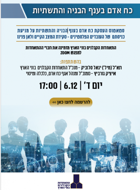 התאחדות הקבלנים בוני הארץ מזמינה את חברי קהילת דור העתיד וקהילת מנהלי הפרויקטים למפגש zoom פתוח בנושא סטאטוס כוח האדם בענף הבניה והתשתיות – סקירה ומענה לשאלות.